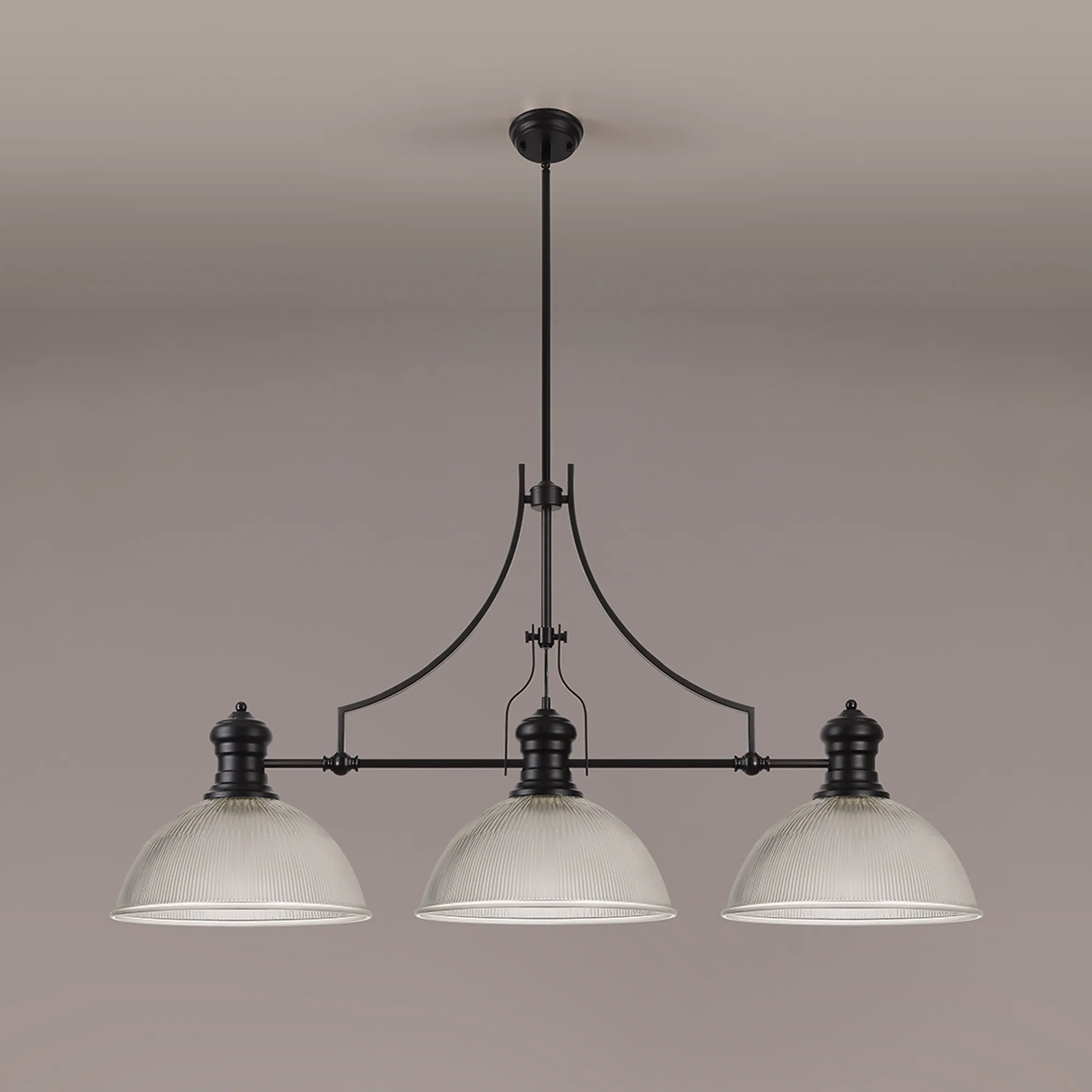 Snowdon Linear Multi Height Pendant With 30cm Flat Round Patterned Shade, 3 x E27, Matt Black/Clear Glass