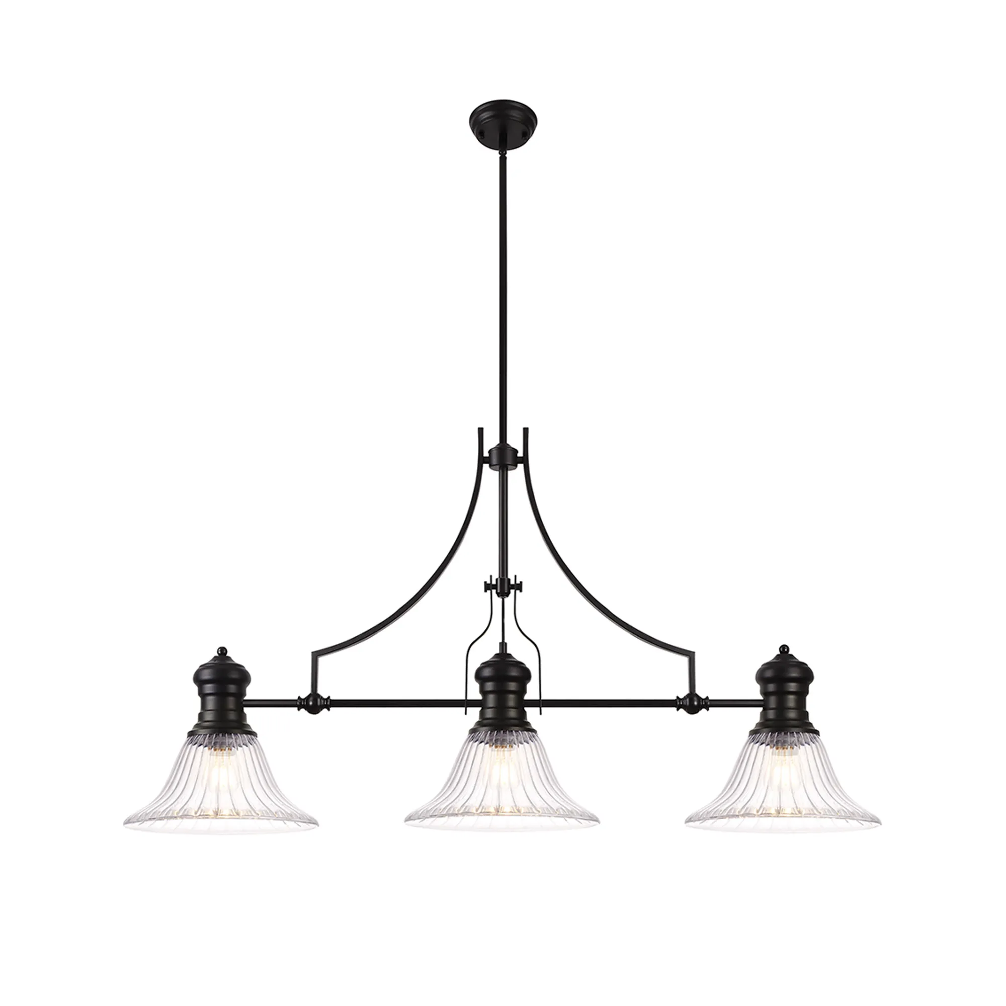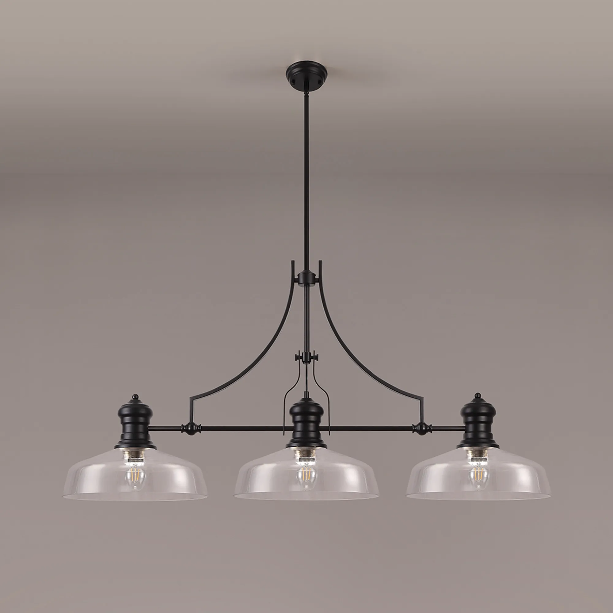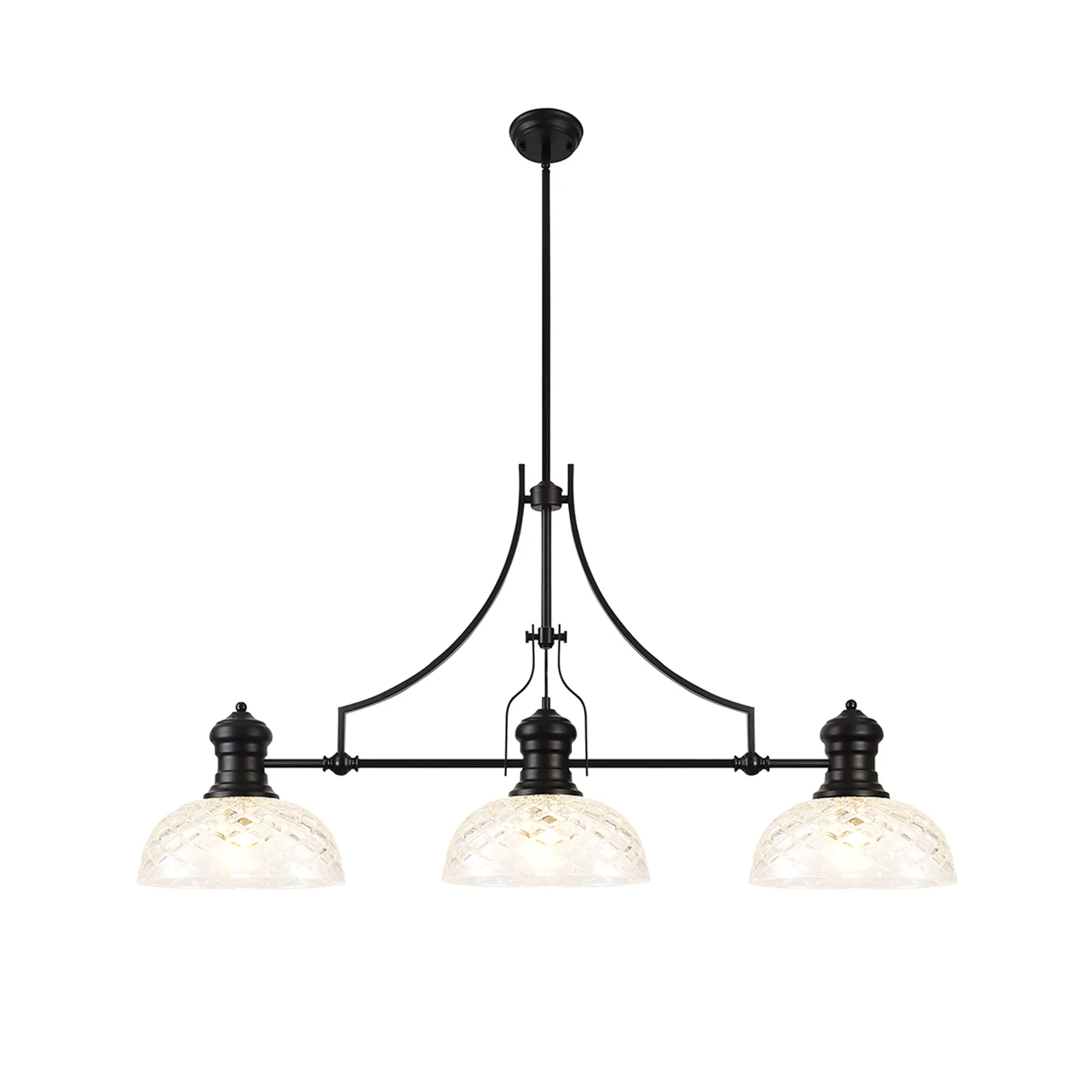 Snowdon Linear Multi Height Pendant With 30cm Flat Round Patterned Shade, 3 x E27, Matt Black/Clear Glass