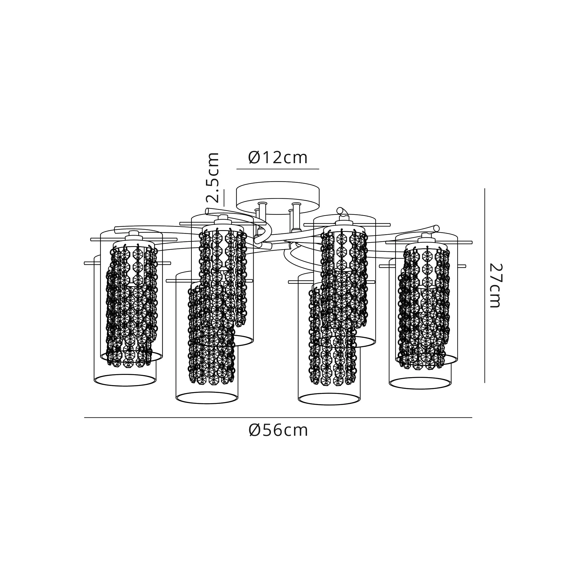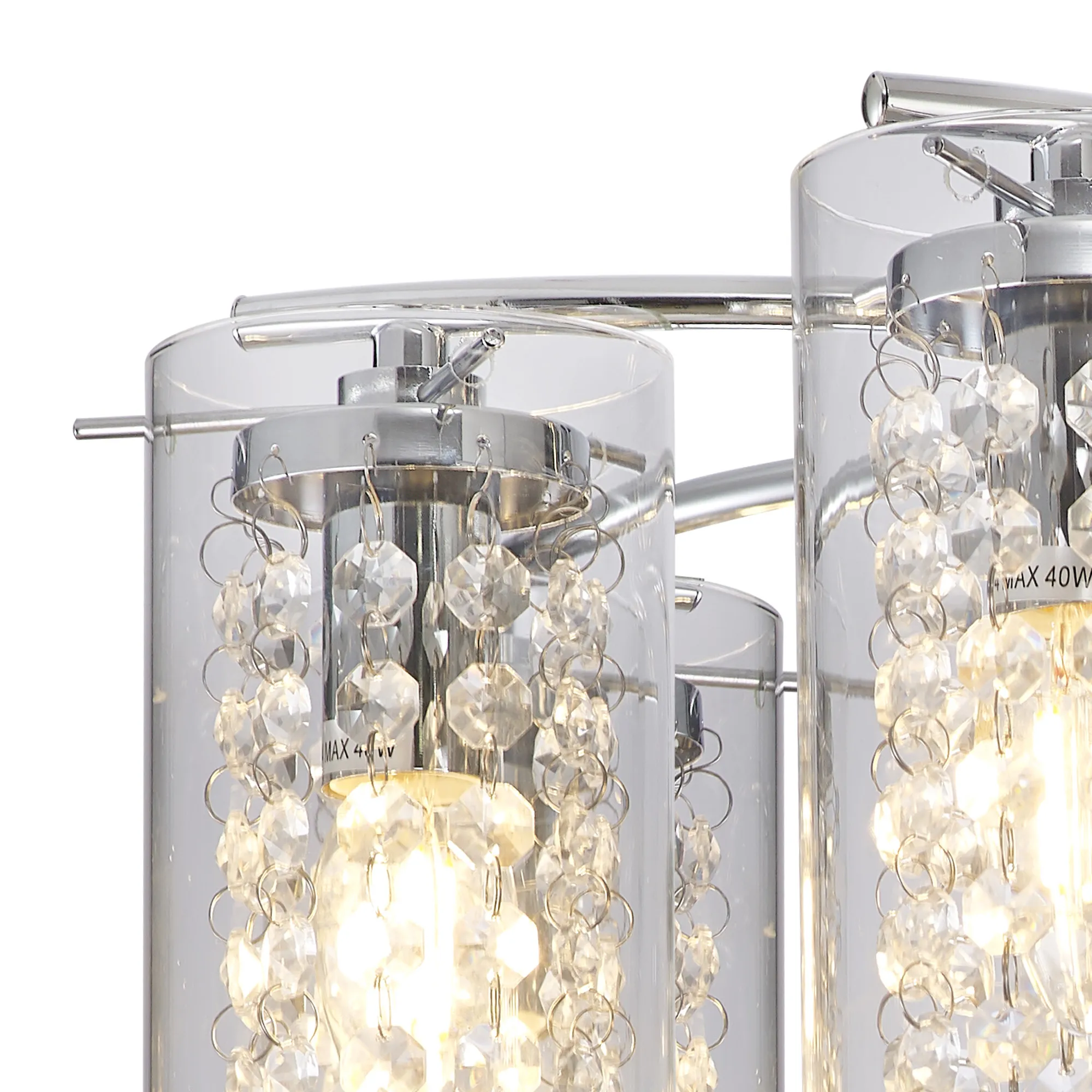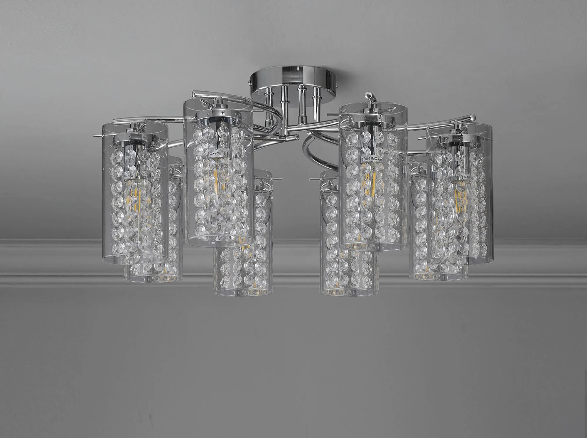 Available in either a 3, 5 or 8 light, the Twizel semi ceiling lights use stylish slim waved arms in polished chrome to hold the E14 lamp holders. Each lamp holder is encircled by a transparent cylindrical glass allowing a clear view of the crystal button strands that hang from the metal lamp holder cup within the glass. The crystal components add an attractive quality to a seemingly simple design which looks even more striking when the fitting is illuminated delivering an exquisite sparkle. Twizel also includes a complementing switched wall and table lamp.
