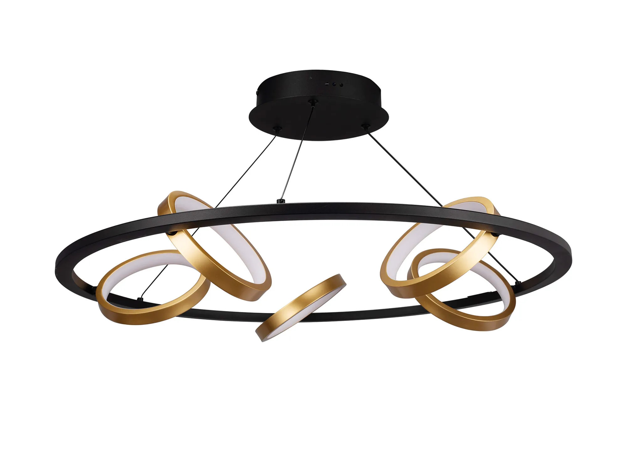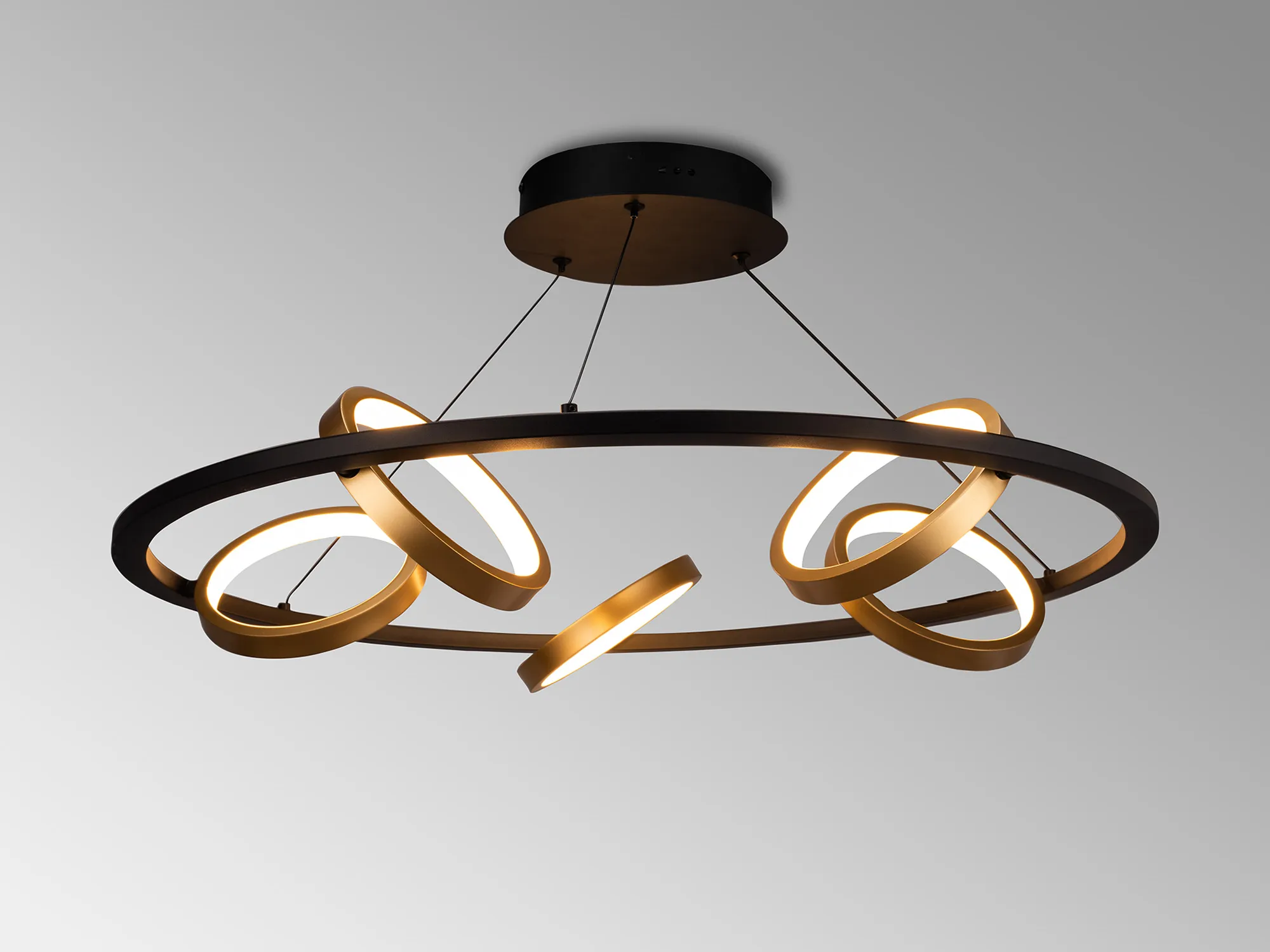 Gold rings encircling halos of integral LEDs are randomly angled within the contrasting satin black frames to create the impact of the Totonto range. The ingenious positioning of each ring gives the illusion that they are floating within the orbit of the dark outer frame construct. A fully comprehensive range, Totonto's designer features can be used as lone items or as a family bringing character to their room setting.