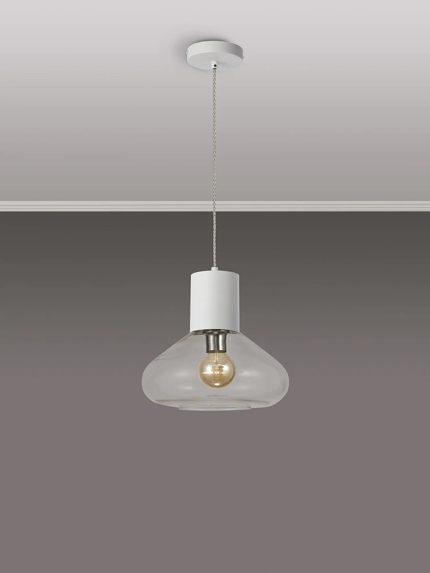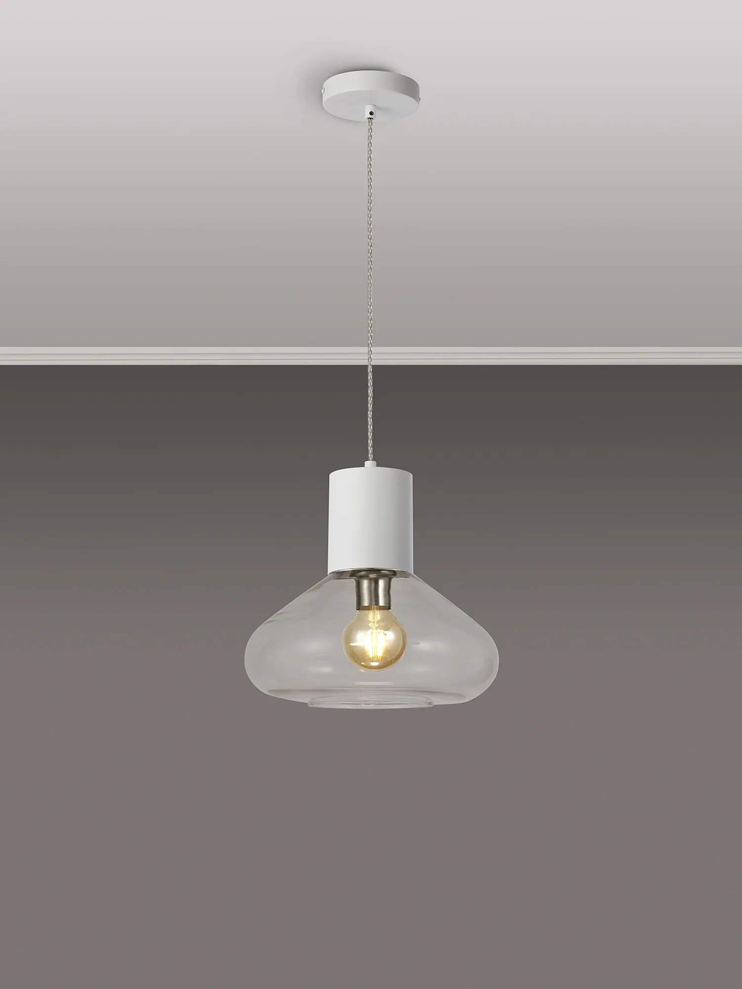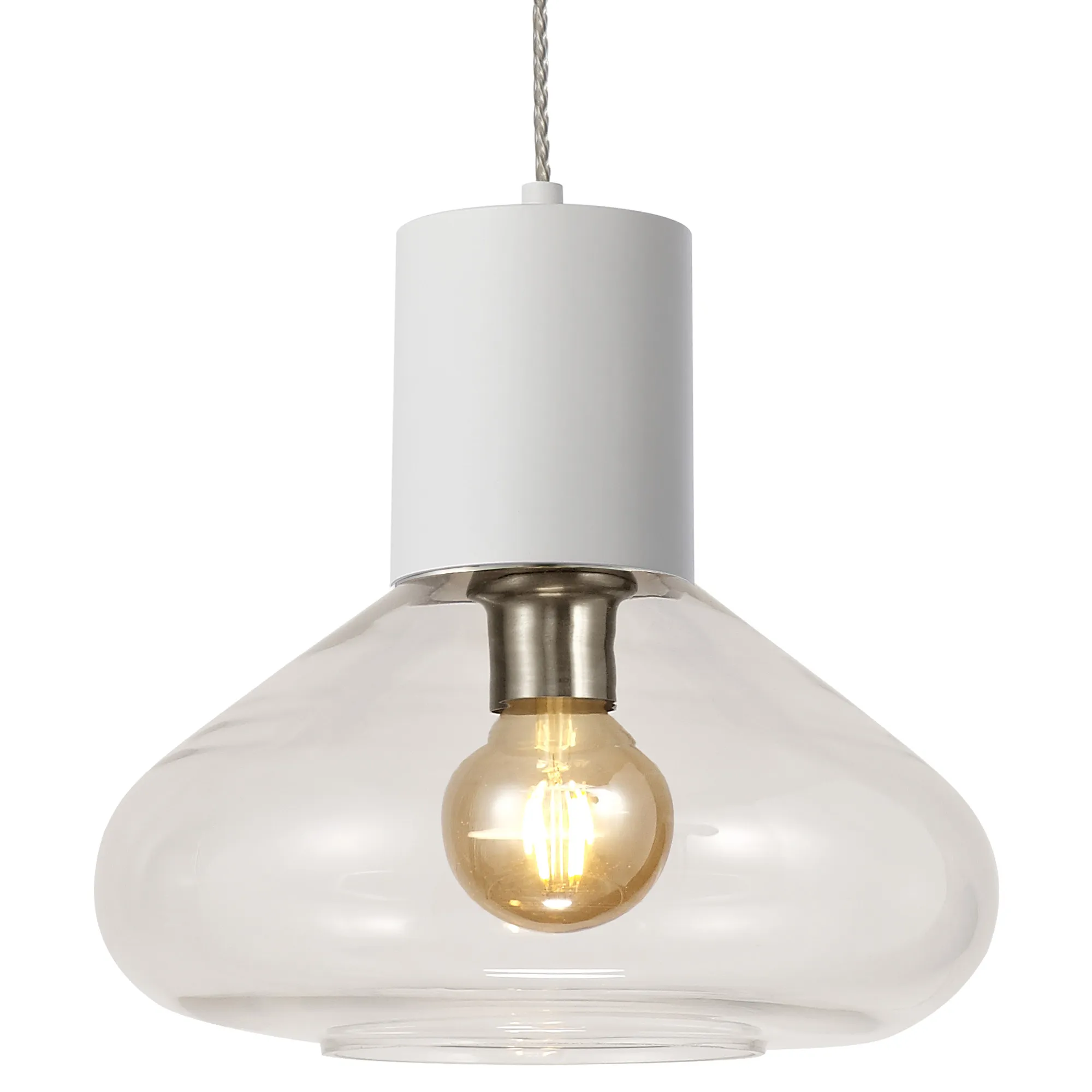 Clyde Pendant With Narrow Glass, 1 x E27, Satin White/Clear/Clear Twisted Cable