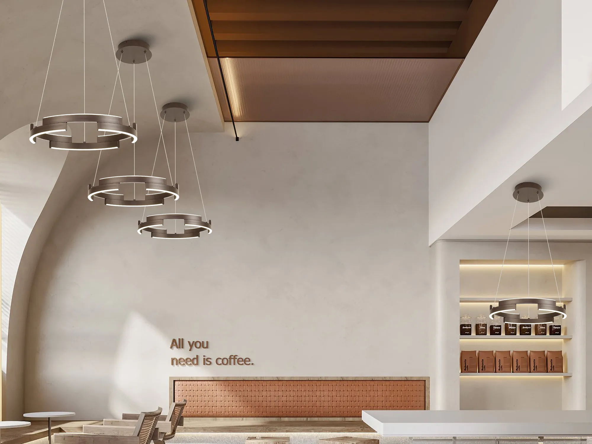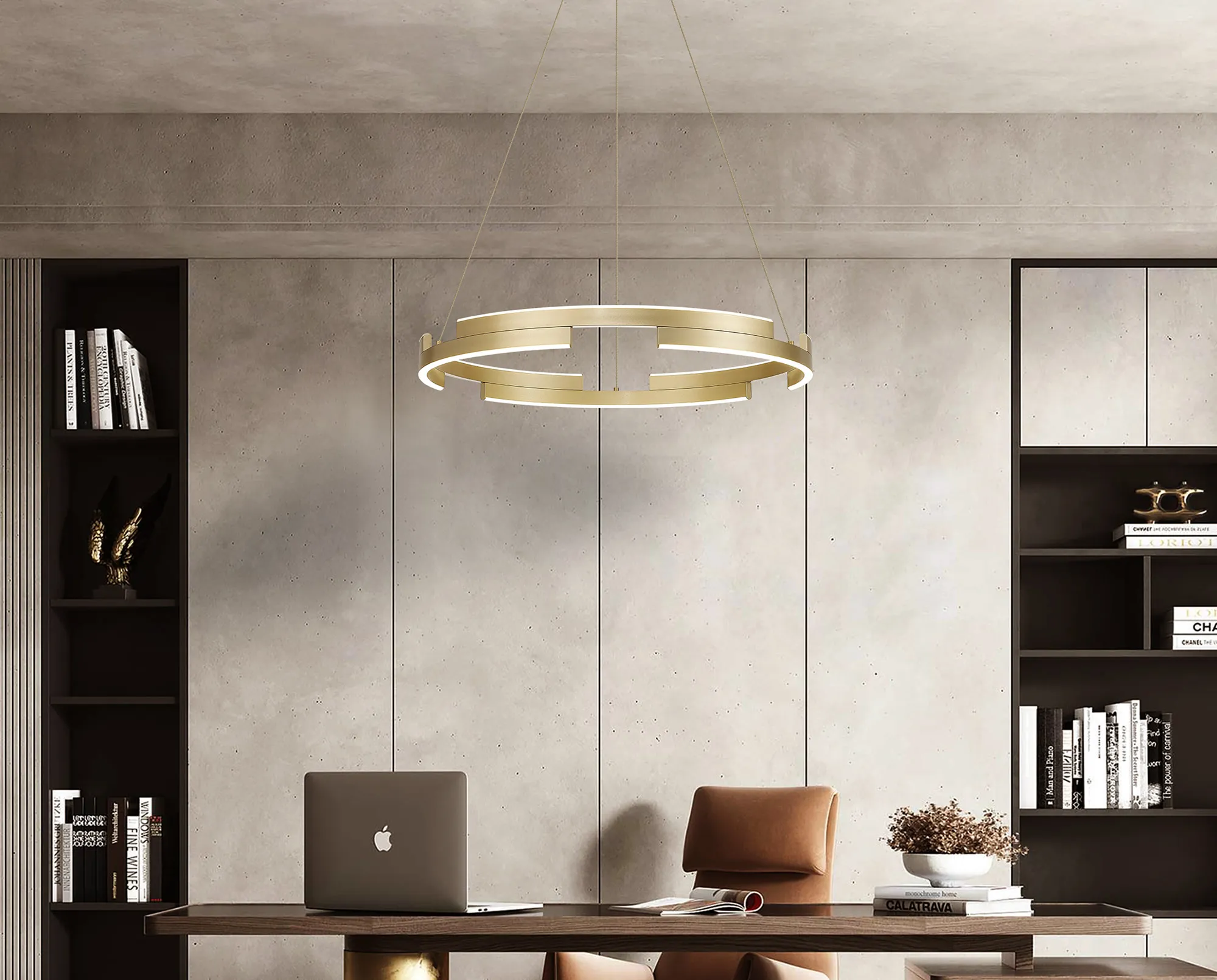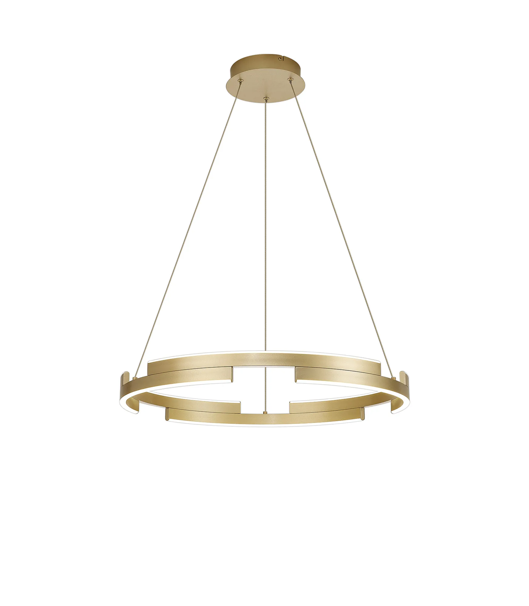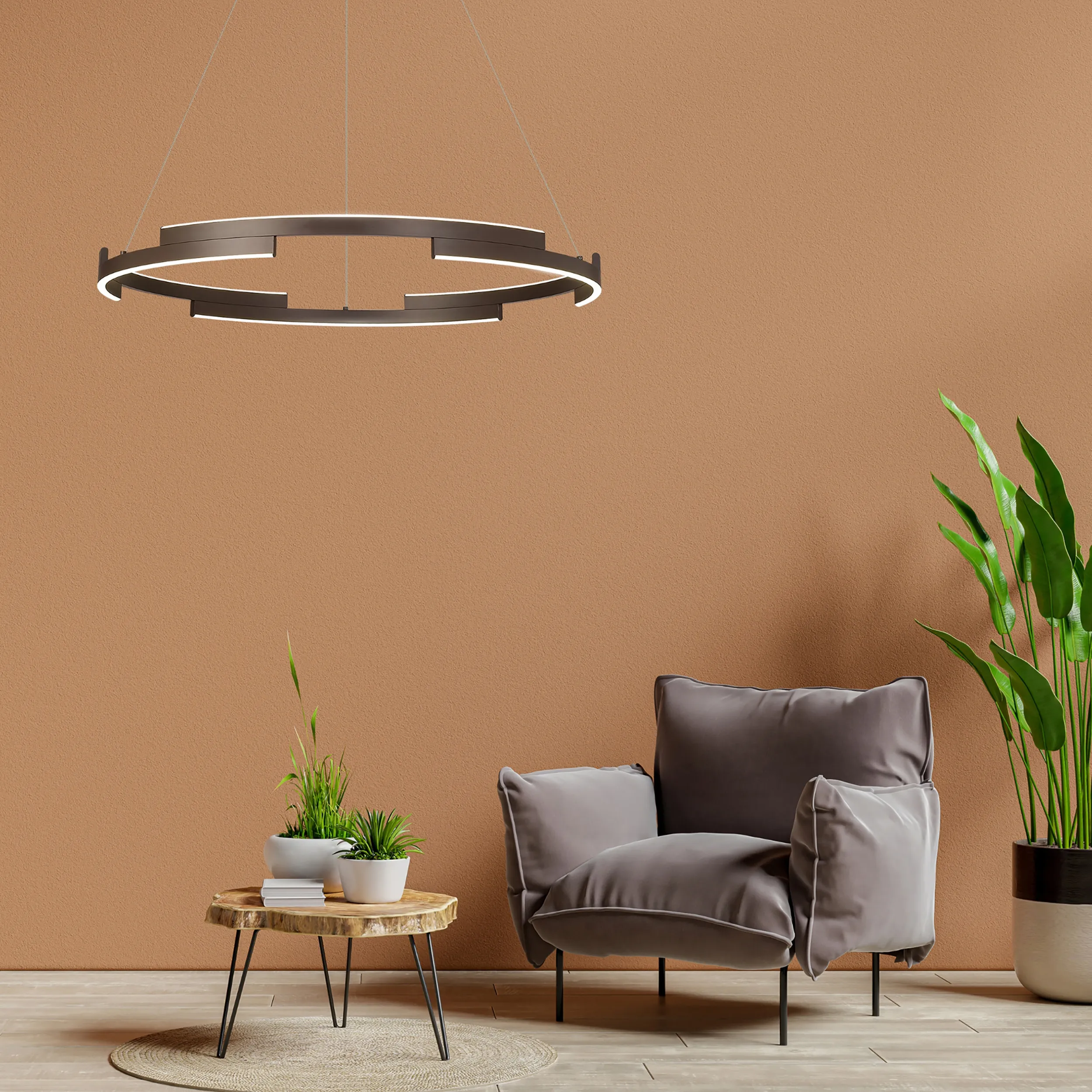 Available in three round sizes and impactful 1.2m linear, the Brooks collection provides an intriguing visual. With a 3-step dimming feature each LED pendant light has a deconstructed hollow ring shape creating extra dimension as well as an eye-catching aesthetic. Brooks is available in either a brown oxide or sand gold colour finish.