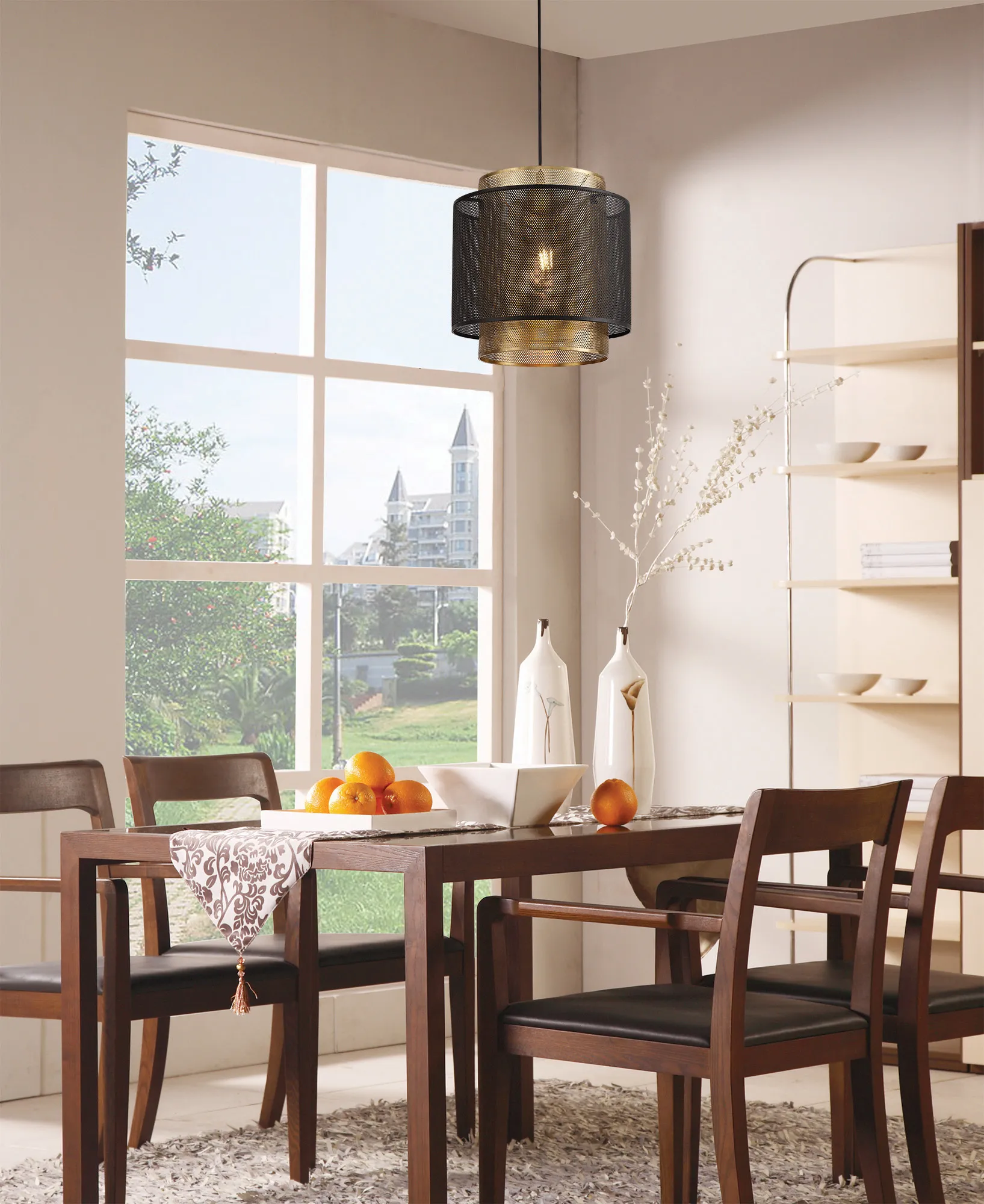 An urban, industrial tone has inspired these single pendants. Available in a large or small version the overlapping cylindrical forms are composed from sheets of mesh metal pieces. The tall narrow inner cylinder is a satin gold finish and the contrasting outer ring is shorter with a matt black finish. Each pendant takes a maximum 60W E27 lamp.