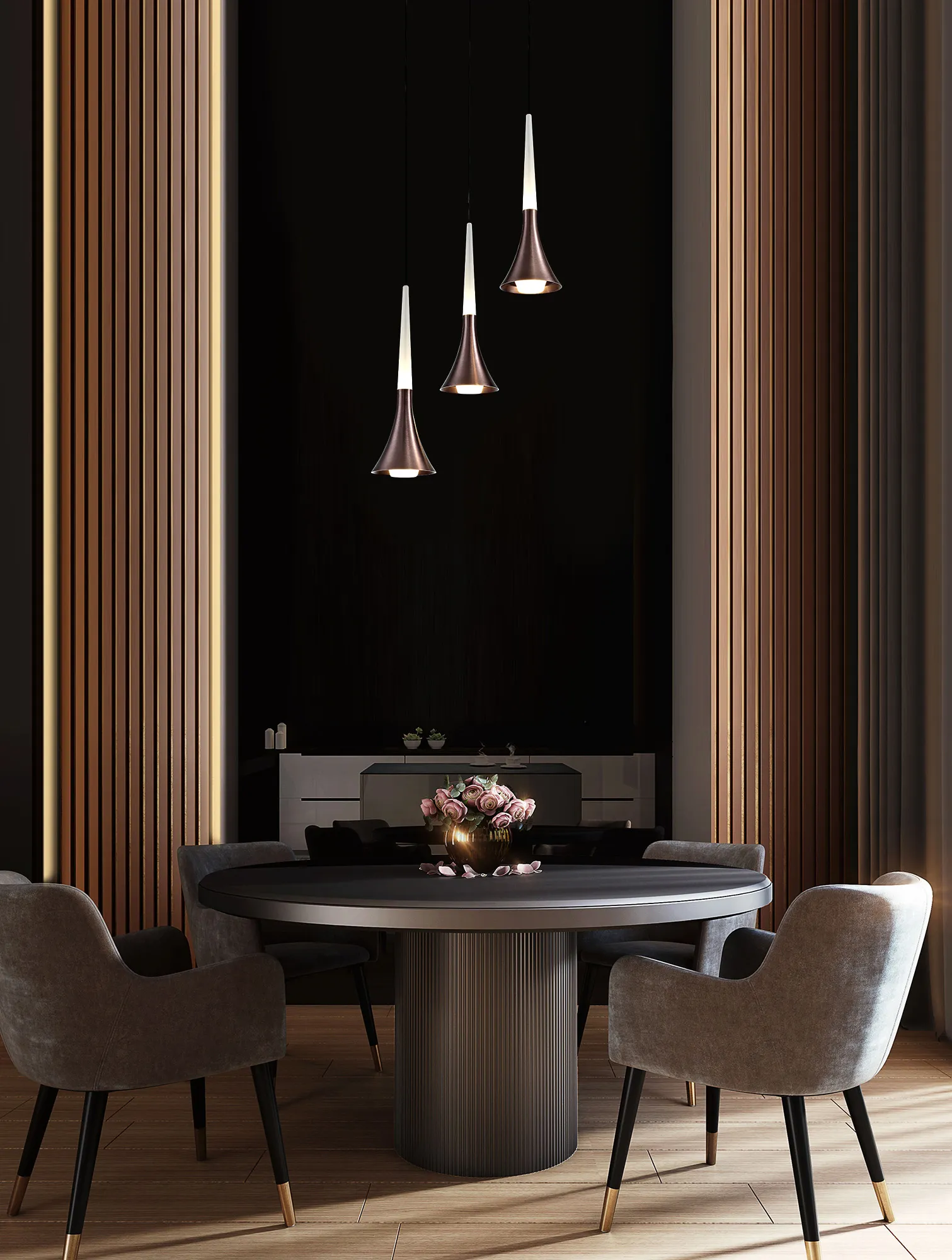A collection of sleek pendants, the modern flared cone shape creates a funnel effect enhancing the light emitted from the integral 3000K LEDs. The satin brown colour finish of the metal framework provides a more adaptable option for neutral room settings where a warmer feature is required, without compromising the benefits of modern LED technology.