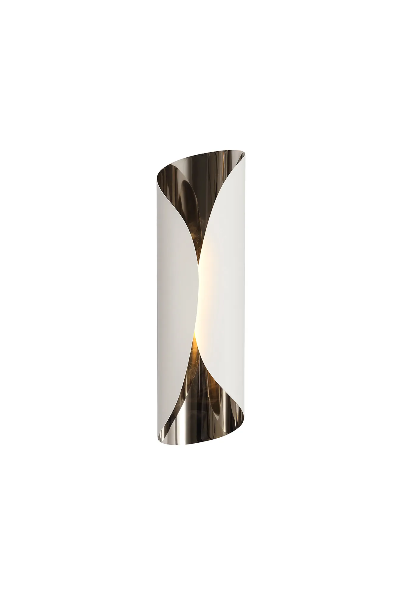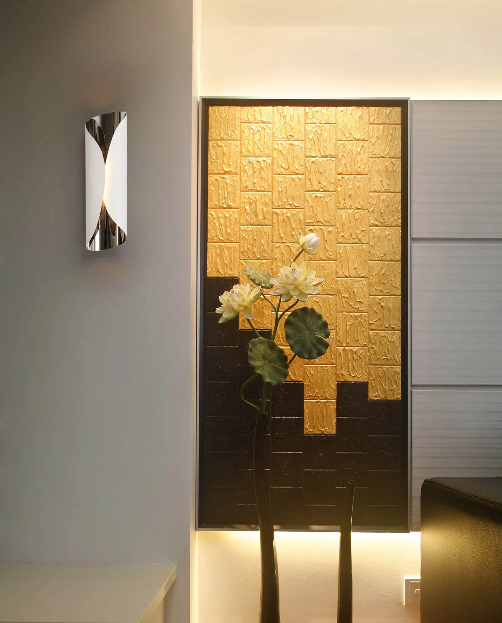 The metal plating of the Masterton LED wall lamp is rolled into a curved overlapping shape creating an original housing for the integral 3000K LEDs. Available with an outer colour finish of either sand black or sand white, the inner coating of both wall lamps is a highly polished chrome, supplying a further augmentation of light reflection.