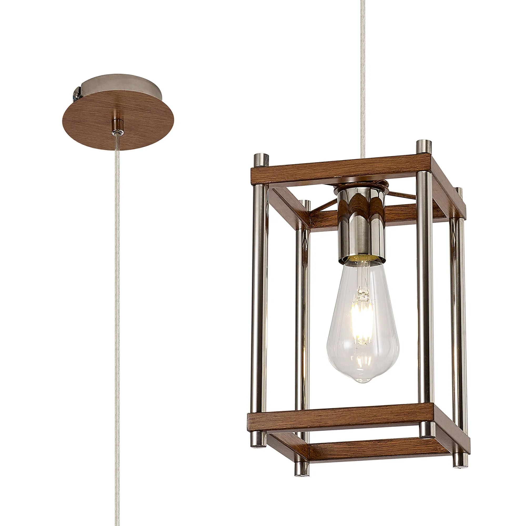 The Moncton range takes traditional metallic colours finishes and blends them with unique, natural elements. Each pendant within the range is an open face lantern design which holds the E14 lamp holders. The polished nickel is combined with a dark walnut effect while the antique brass is partnered with a lighter medium oak colour. Both of the two finishes are applied to the fixtures in equal measures carried throughout the lights and even extending to the ceiling plates where the wood grain is used in contrast to the metal of the back plate.