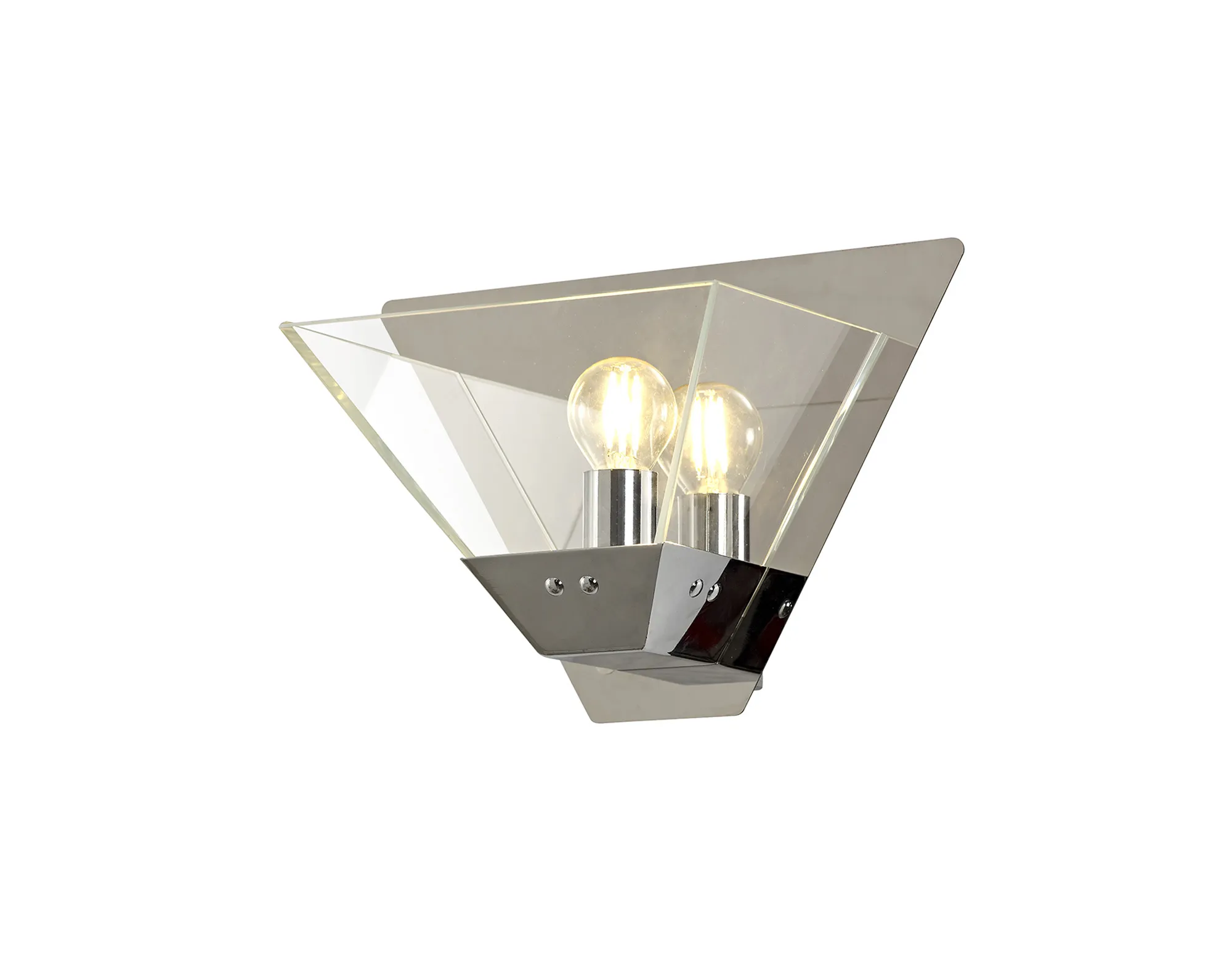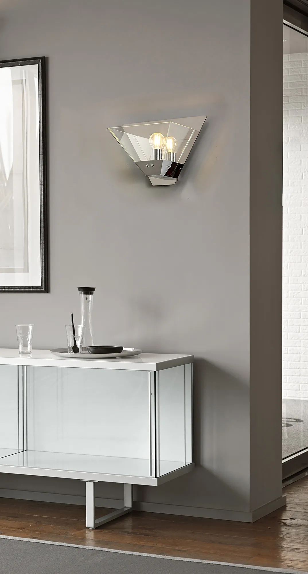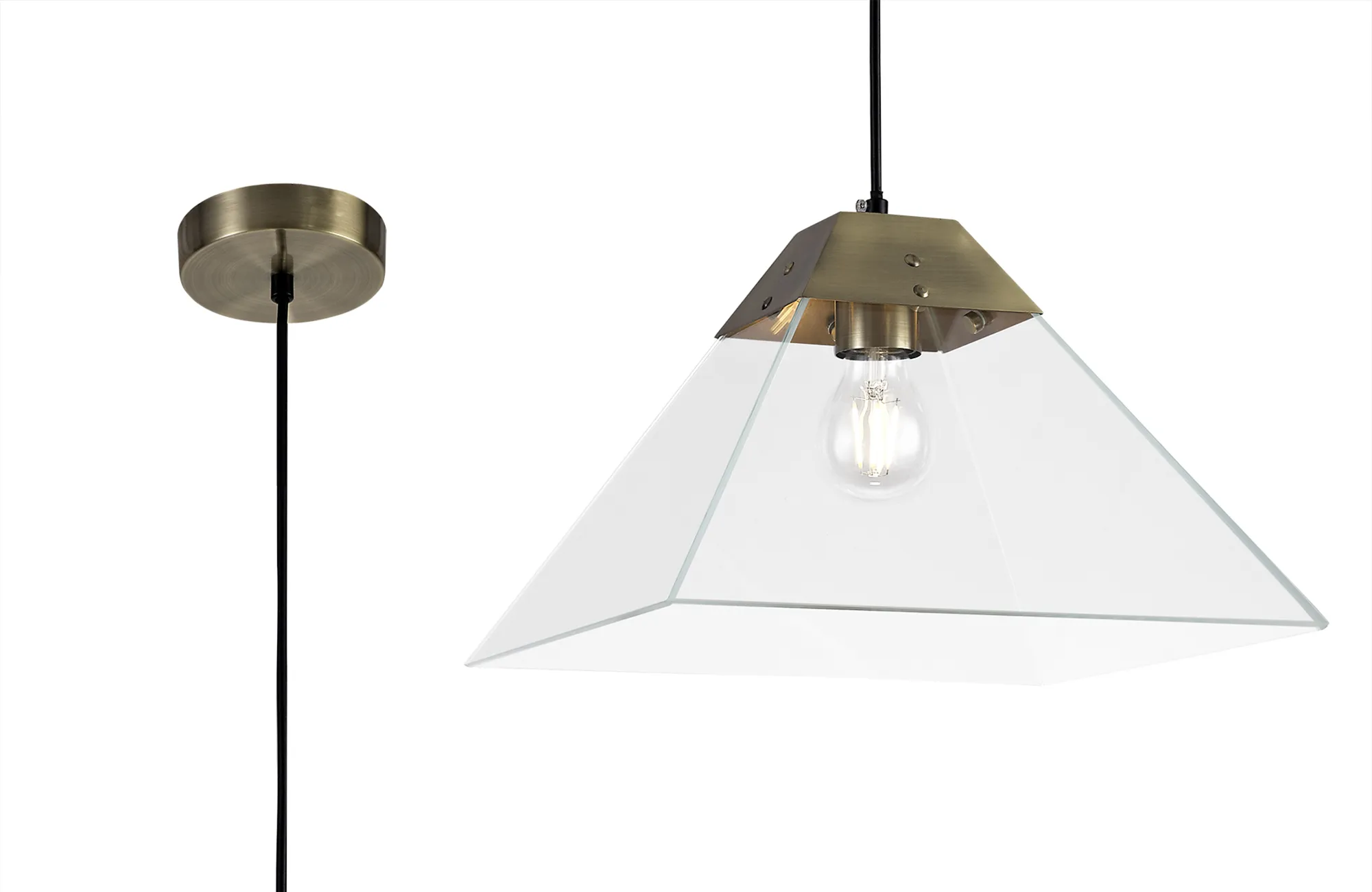 Nelson utilises the maximum output possible for the chosen E14 or E27 lamp, by transferring the traditional pyramid shape of fabric shades onto a transparent material. The open glass forms not only allow a wider projection of light from the open space but also permit a more overall ambient dispersion of light through the clear glass sides. The wall lamps within this collection are particularly prominent with the trapezium plate reflecting the lines of the glass housing. Both the single pendants and wall lamps are available in either a polished chrome or antique brass colour finish.