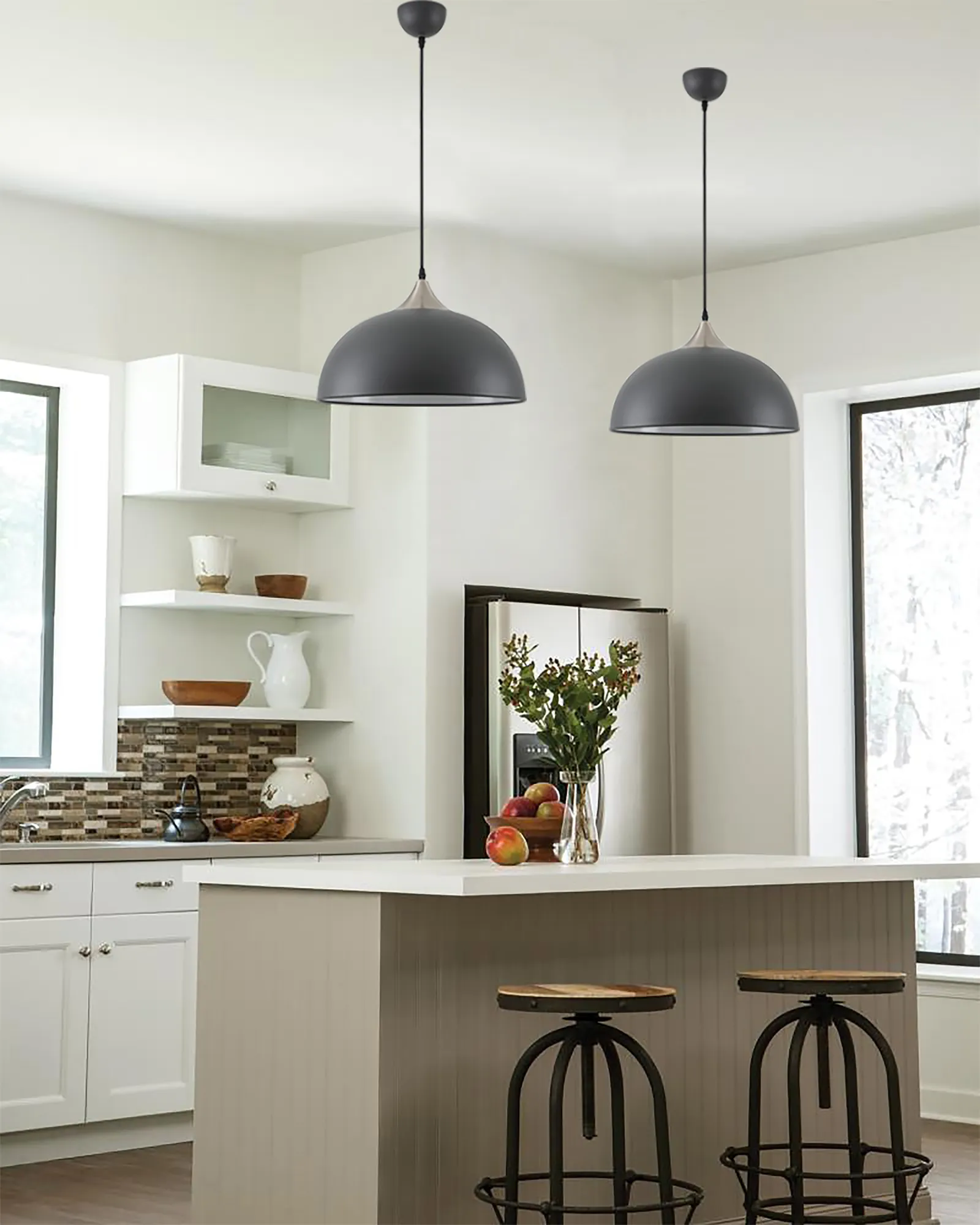 A uniform bowl shape forming the Pankhurst collection provides an ample shade for the downward directionality of light from the E27 lamp holder which it houses. Their dome ceiling cups reflect the form of the 38cm and 50cm metal shades shape allowing a cohesive design. The sand effect of the neutral colour finishes available partner well with the small satin nickel components ensuring the light blends with the décor of its chosen setting.