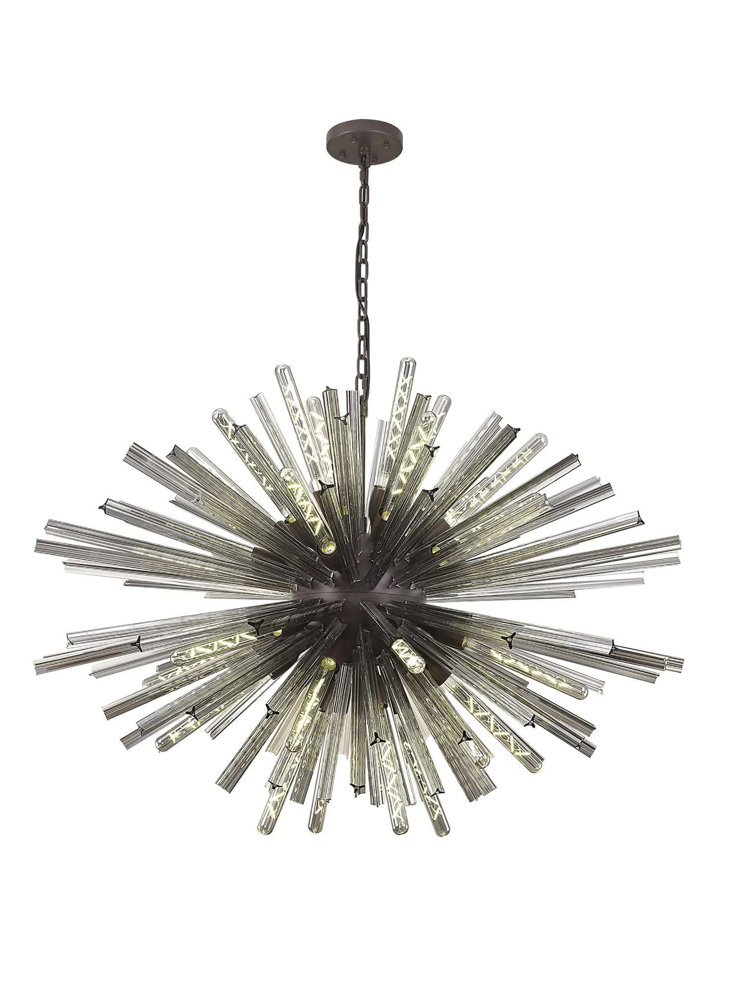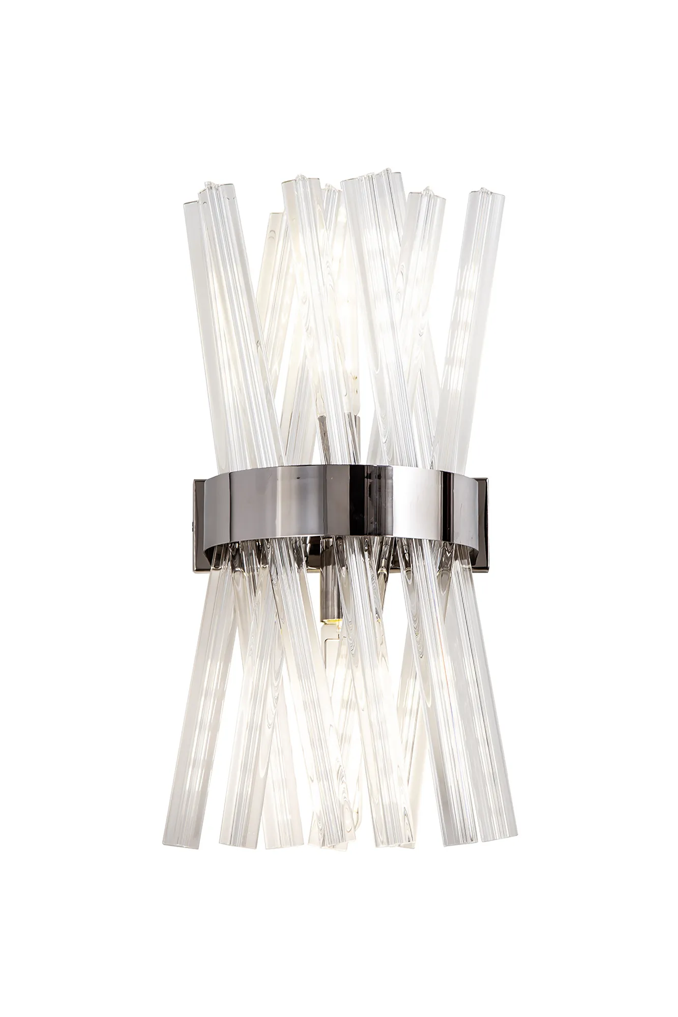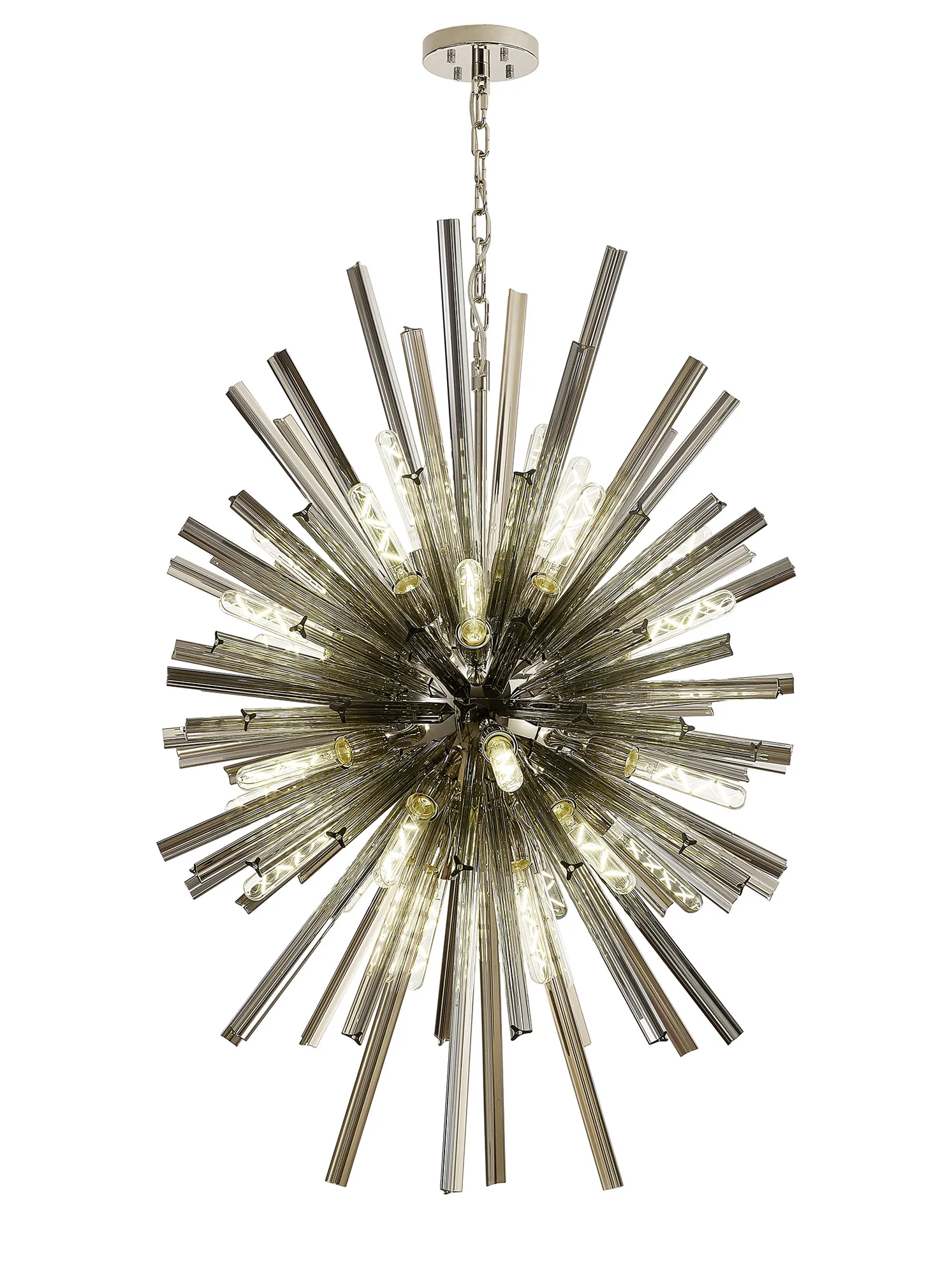 This collection presents an intriguing glass moulded into a three dimensional triquetra. The grooves on the glass create an appealing optical effect that is enhanced with the use of tubular lamps. Within this collection of ceiling, pendant and wall lamps each frame in brown oxide, polished nickel or matt black can be paired with either clear, champagne or smoke glass.