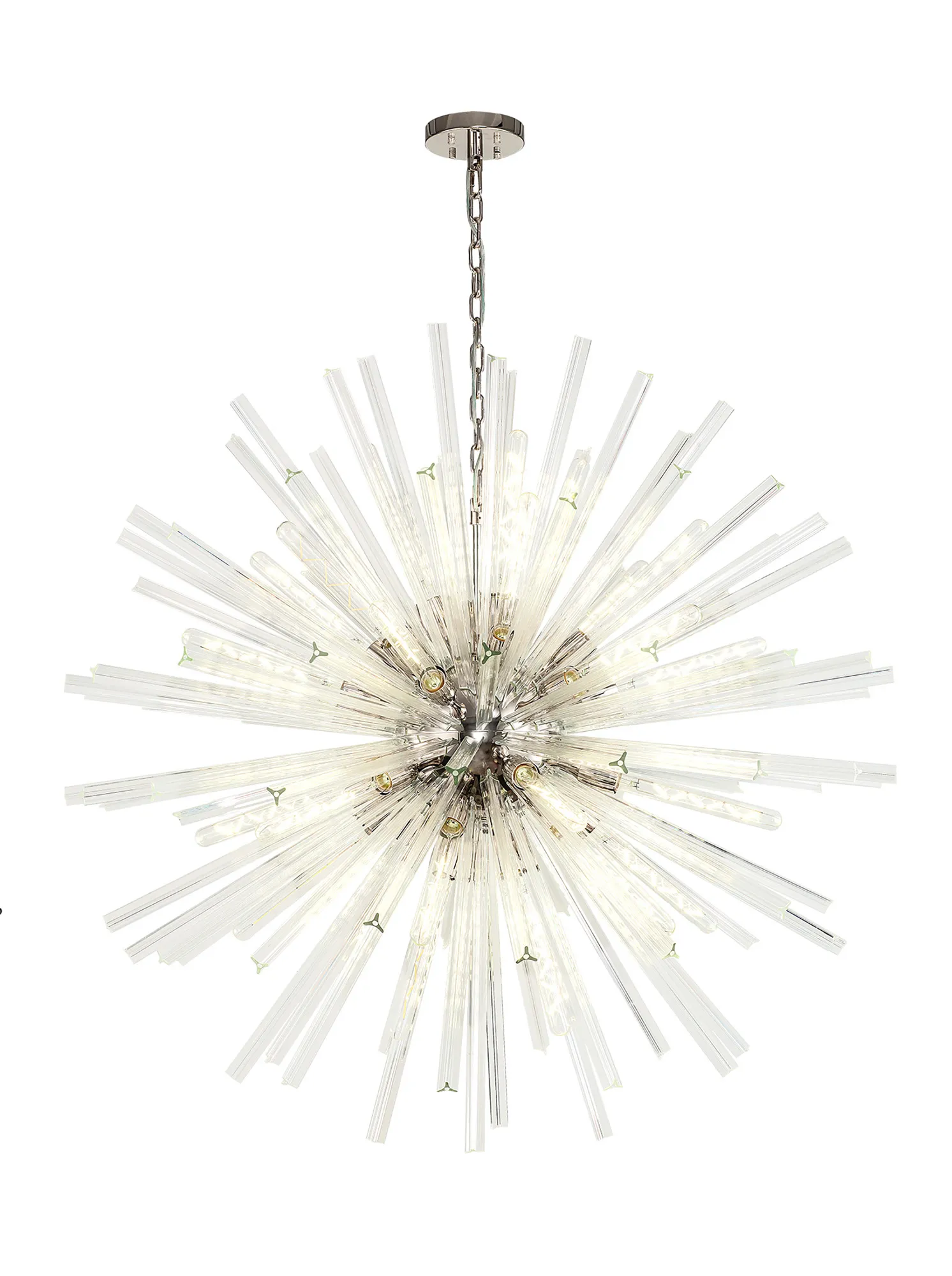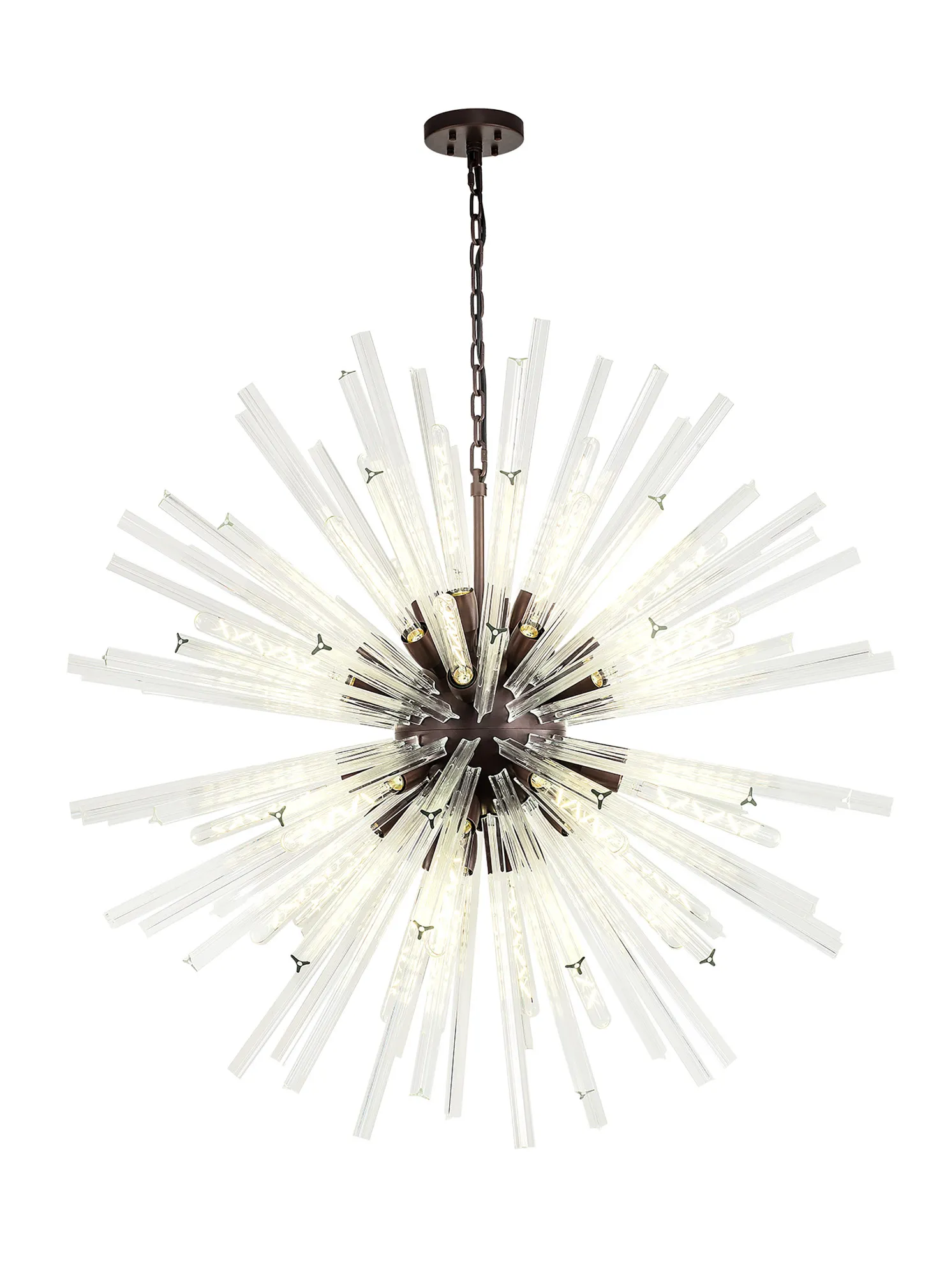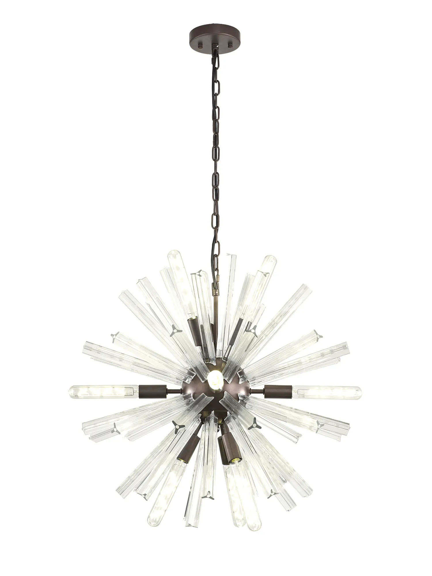 This collection presents an intriguing glass moulded into a three dimensional triquetra. The grooves on the glass create an appealing optical effect that is enhanced with the use of tubular lamps. Within this collection of ceiling, pendant and wall lamps each frame in brown oxide, polished nickel or matt black can be paired with either clear, champagne or smoke glass.