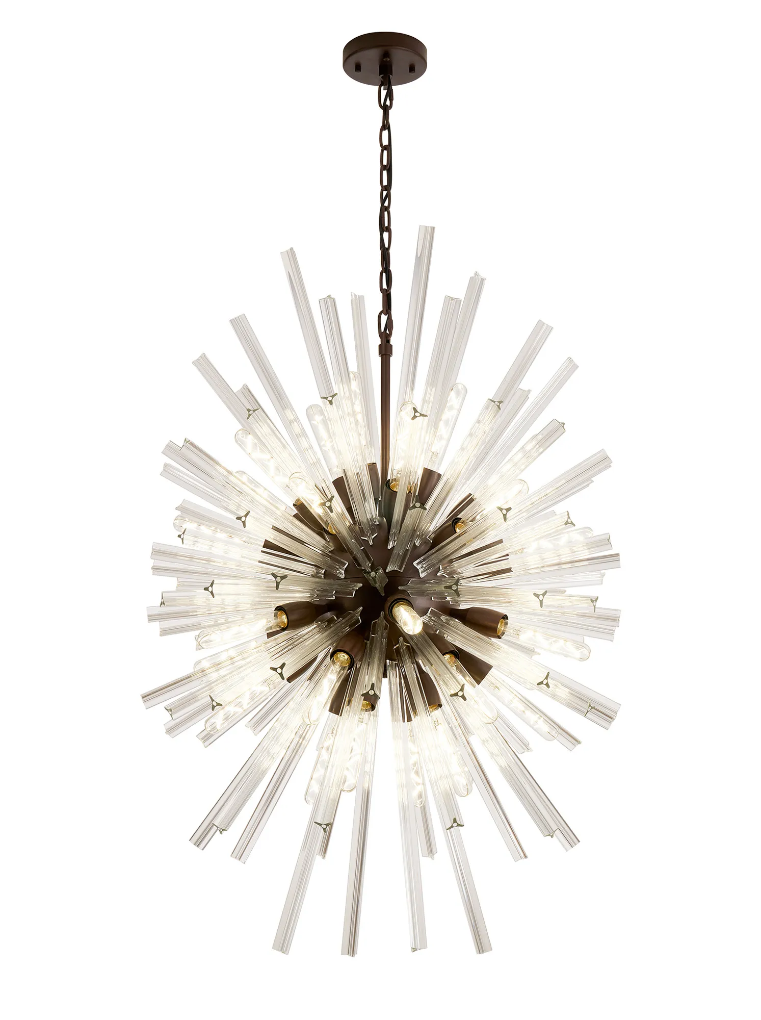 The Tora collection presents an intriguing glass shape moulded into a three dimensional triquetra. The grooves along each sized glass create an appealing optical effect which is effortlessly enhanced with the use of tubular lamps. The wide variety of fixtures available in this range span from a 6 light semi flush to an impacting 32 light pendant. The complementing wall lamps available allow for further application built around the same lighting family. Each frame can be chosen with either a brown oxide, polished nickel or matt black frame with either clear, champagne gold or smoke glass.